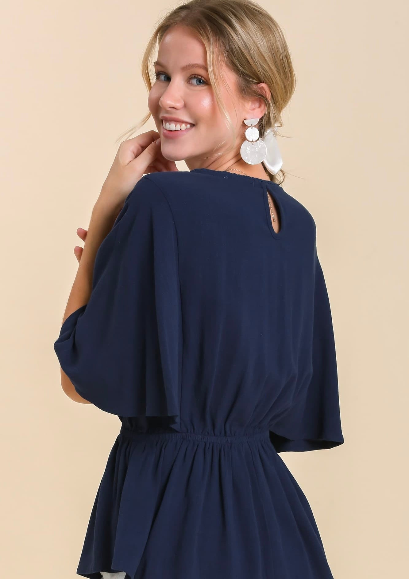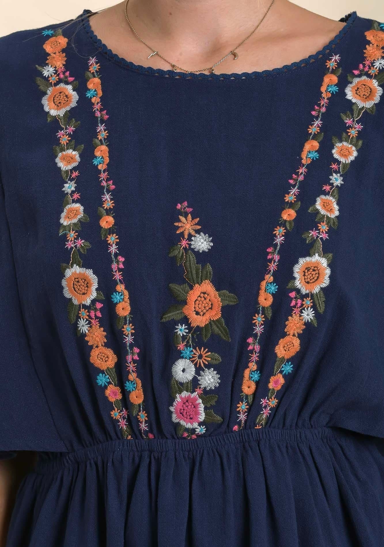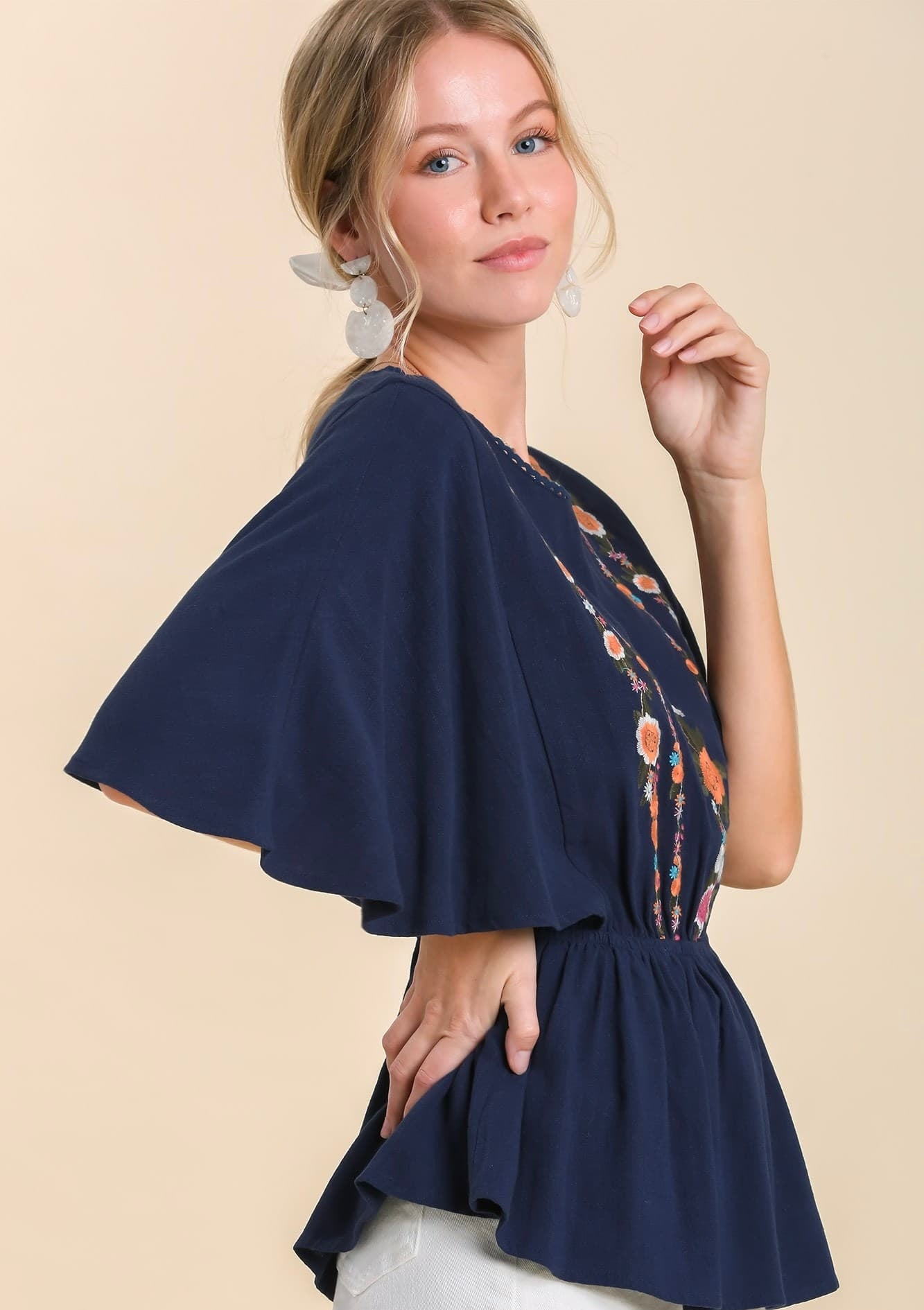 Woman wearing a navy blue top with floral embroidery on a beige background