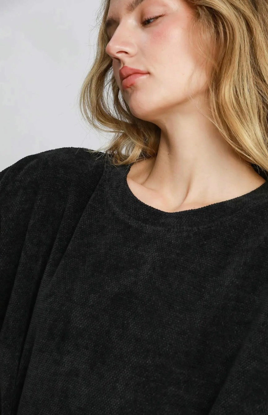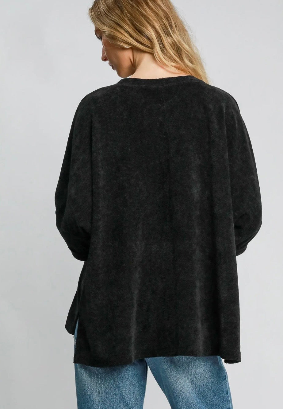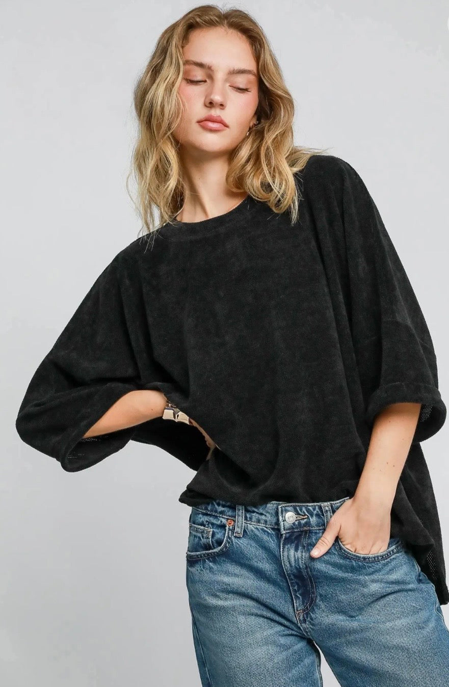 Oversized round neck topChenille High Low Hem Cut Edges 3/4 Sleeves