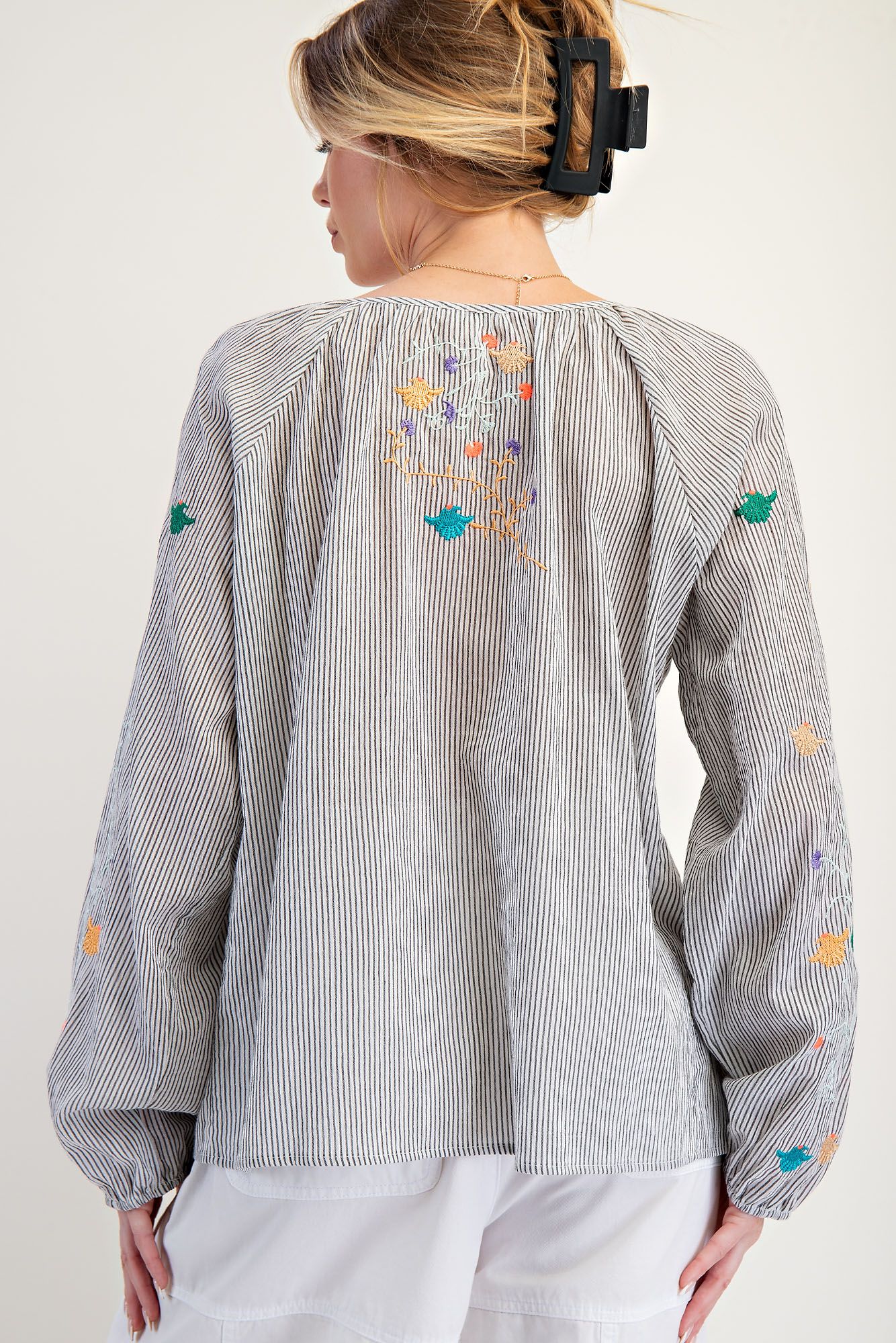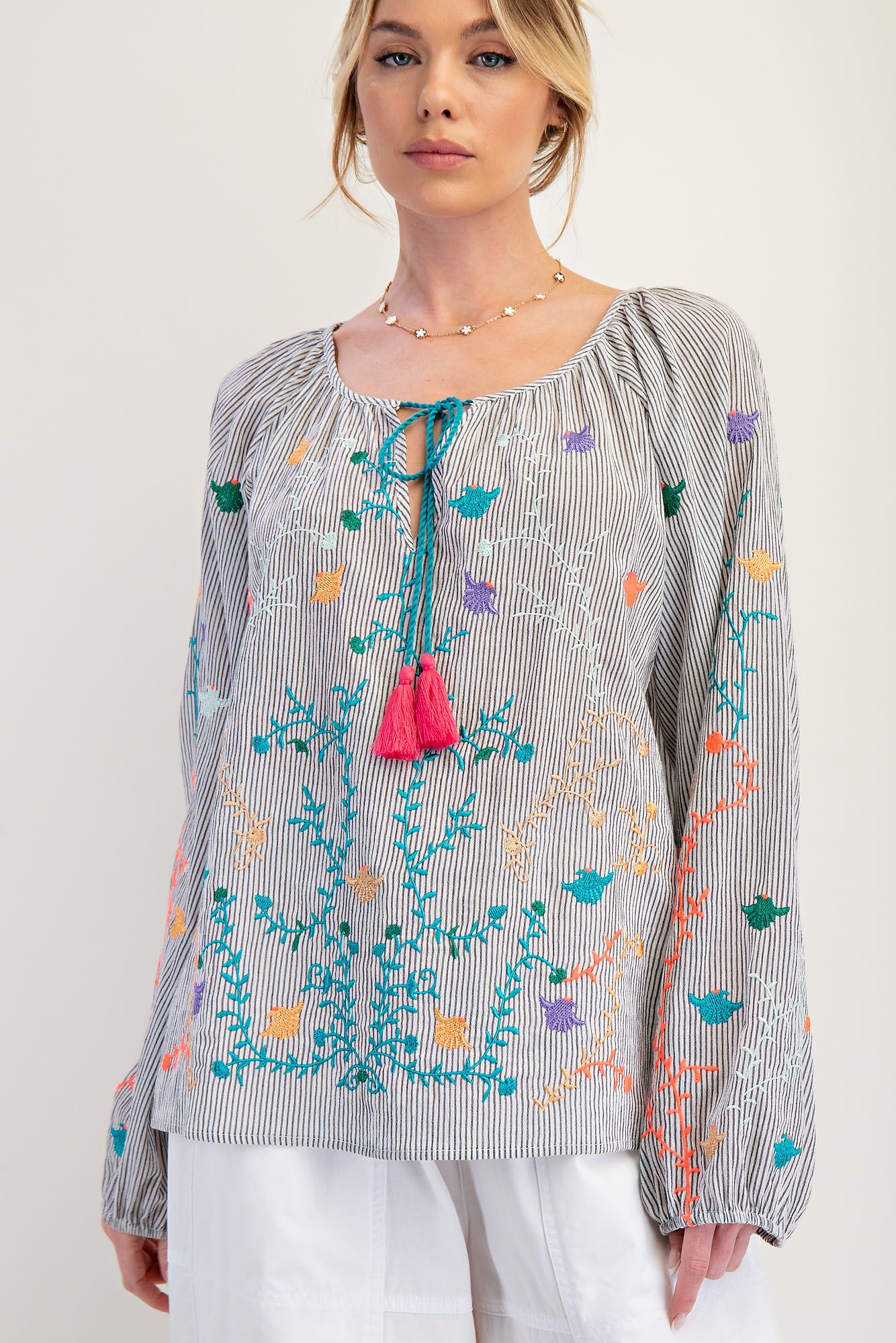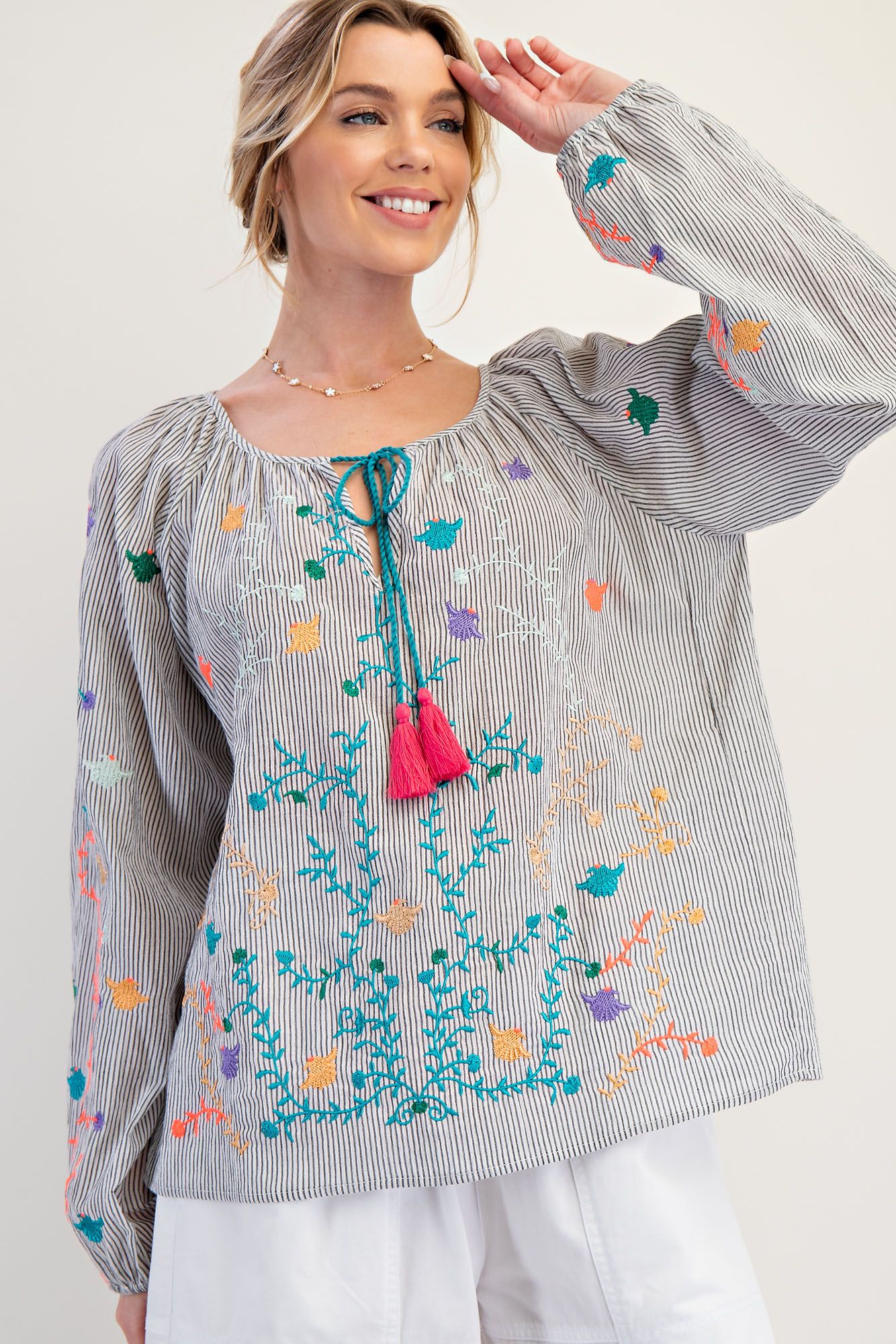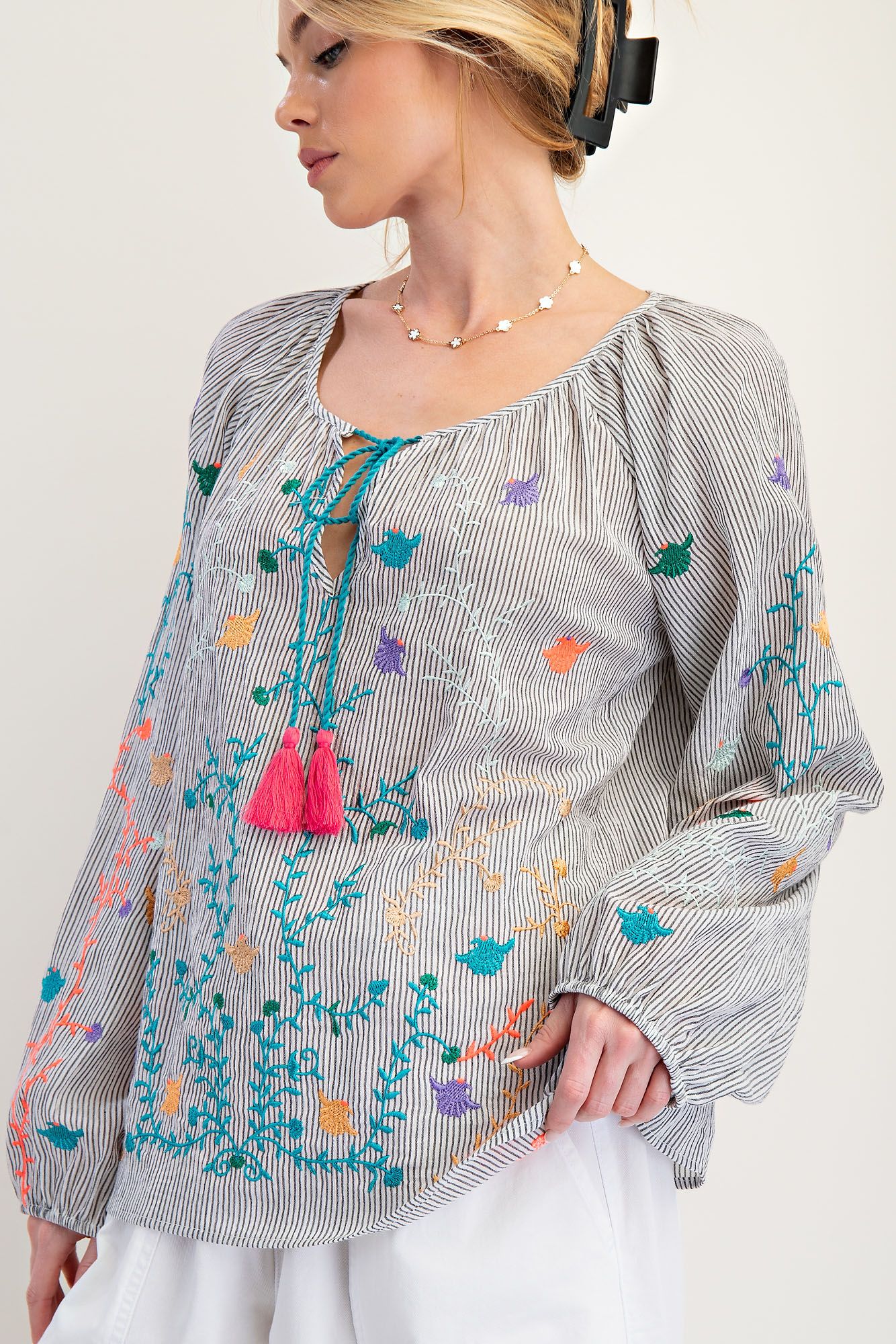 Elevate your wardrobe with this charming embroidered pin stripe woven blouse. Crafted from 100% cotton, this lightweight piece features delicate floral embroidery on the front and back, a rounded V-neckline with tassel tie closure, and cinched cuffs for a polished finish. The relaxed, loose fit offers all-day comfort and effortless style. Perfect for layering or wearing solo. This top will be your favorite!