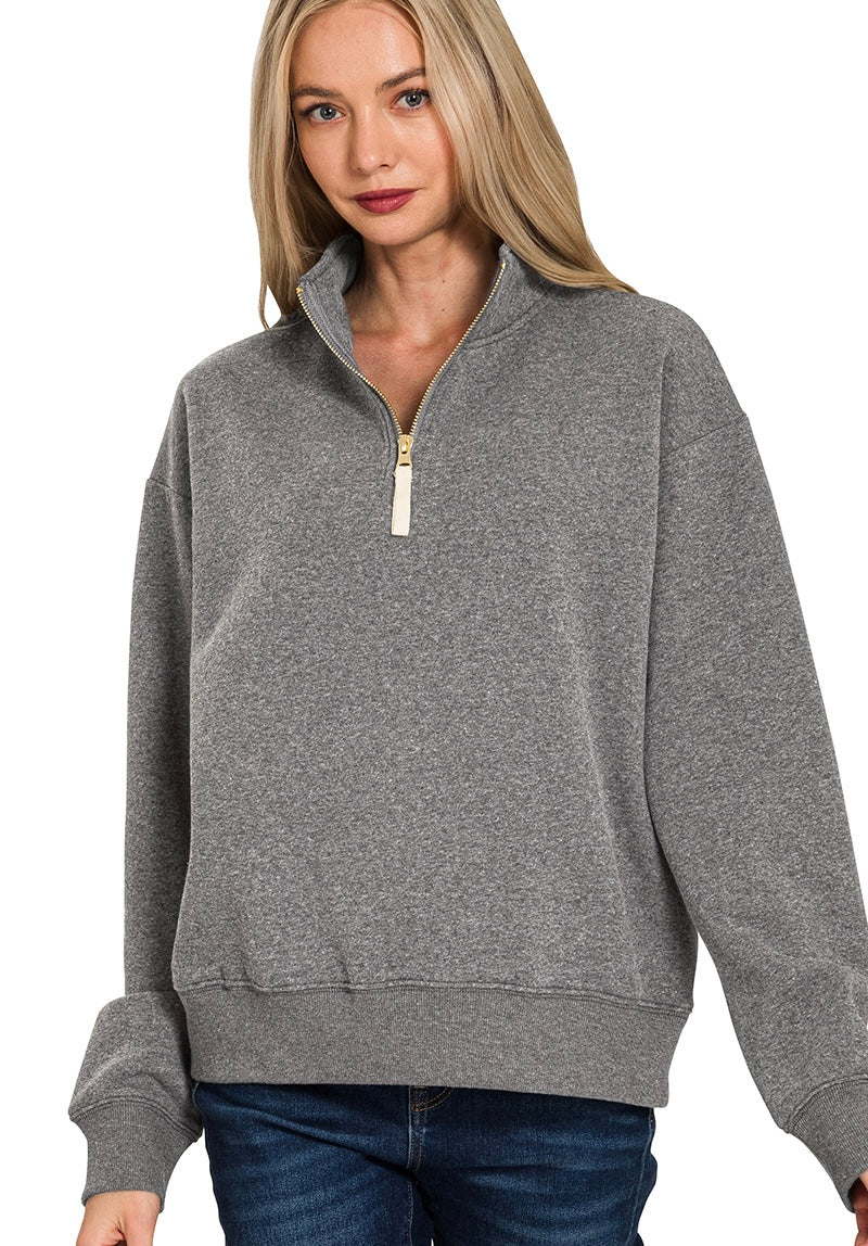 Woman wearing a gray pullover with a quarter zip on a white background