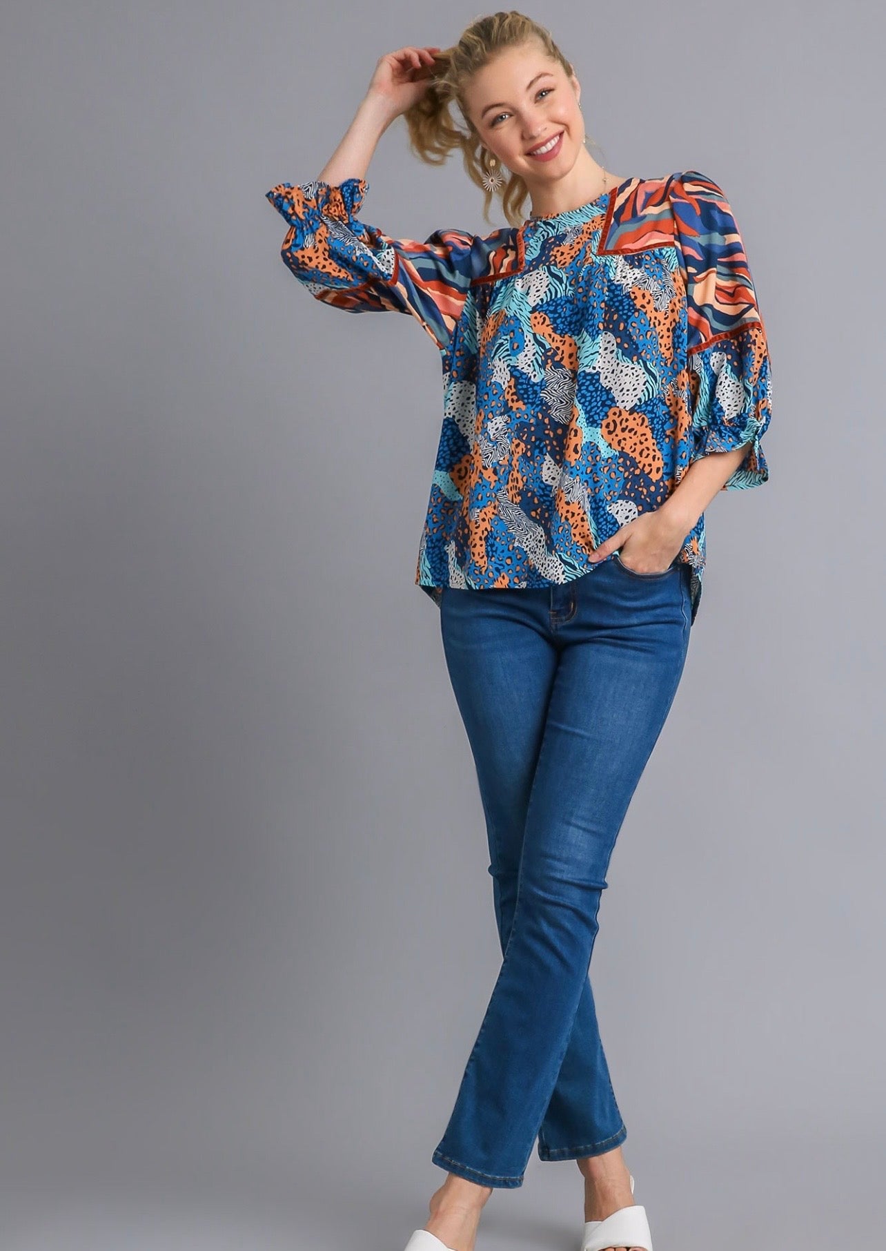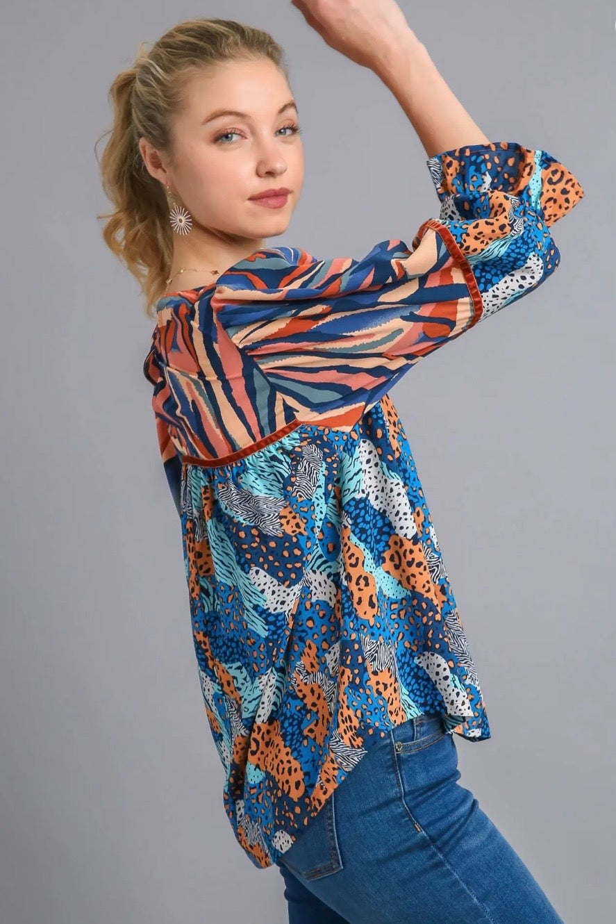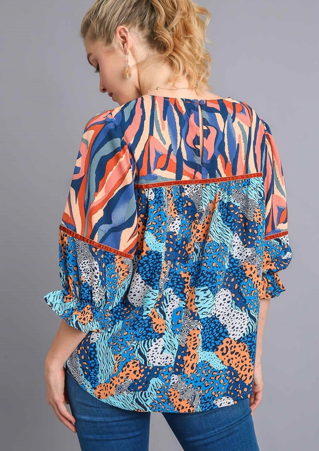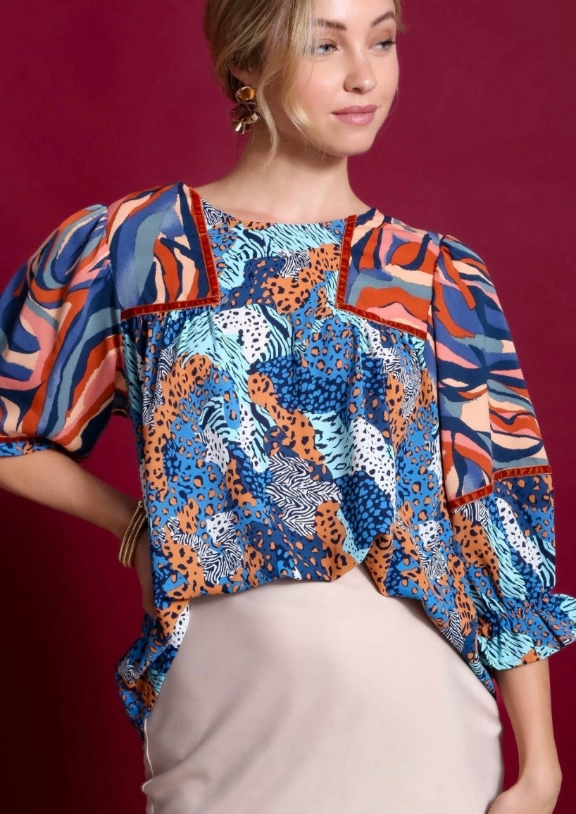 Mixed print with velvet trim. This top is beautiful! Loose fit but true to size, eastic in bottom of sleeves. Babydoll style.